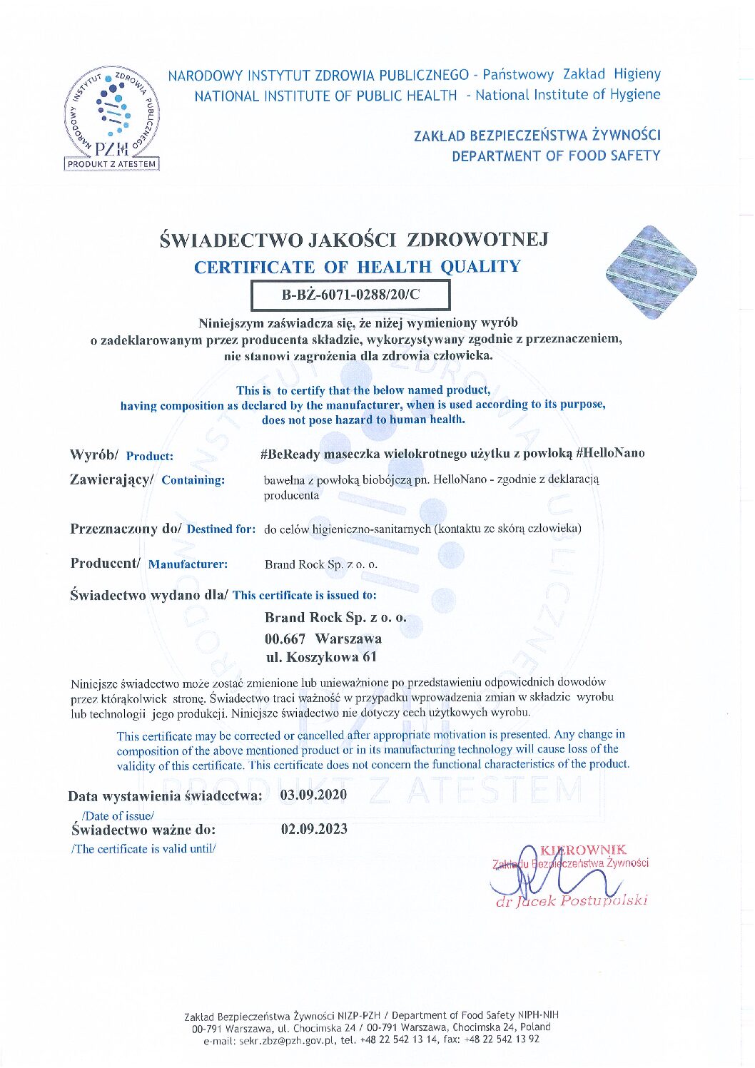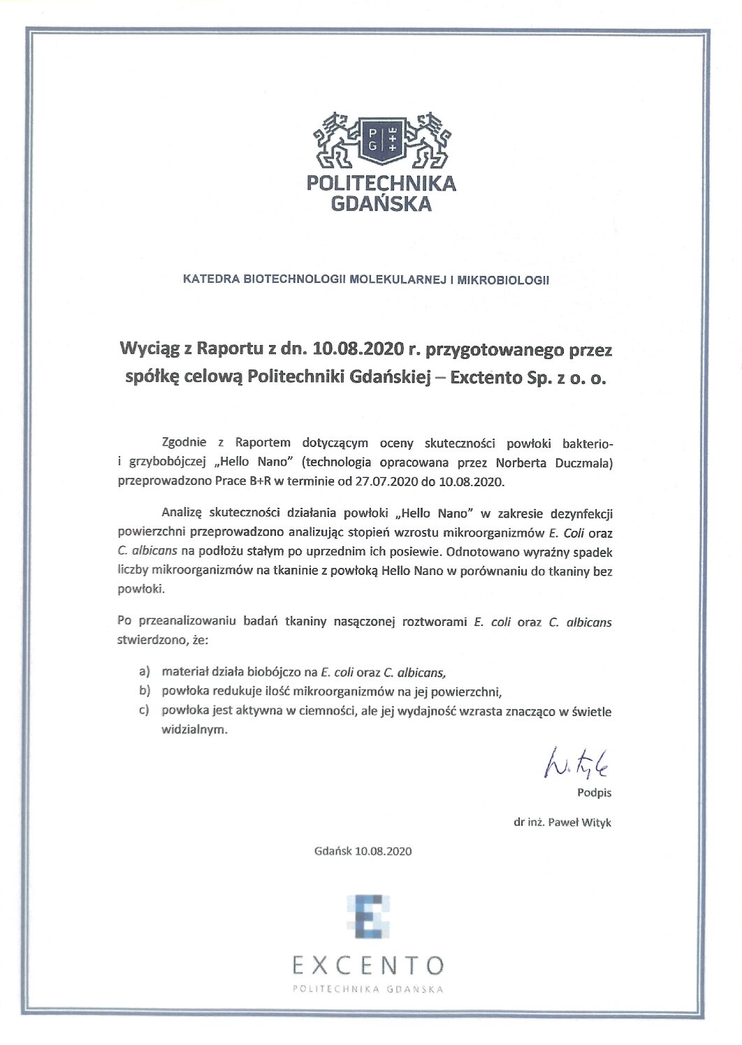 Liczne badania laboratoryjne wykazały, że mająca kontakt z dowolnym związkiem organicznym powłoka pozostaje biologicznie czystą, gdyż skutecznie rozkłada wszystkie chorobotwórcze drobnoustroje, czyniąc je nieszkodliwymi dla zdrowia. Innowacyjność powłoki Hello Nano, to potwierdzona skuteczność biobójcza, neutralizacja zapachów i plam organicznych.